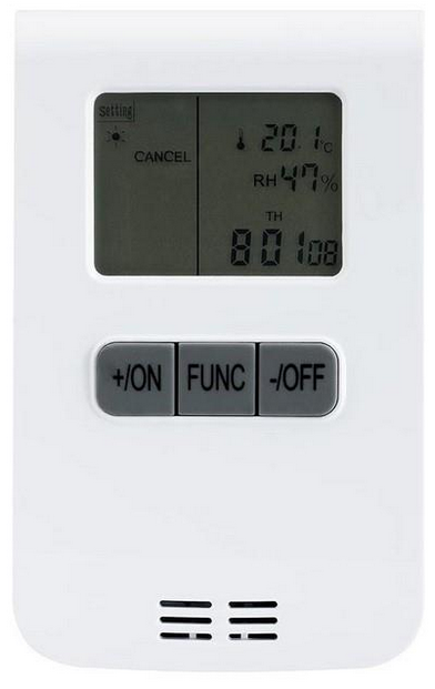Press FUNC button to enter the hours setting, then press +/ON or -/OFF button to adjust the hour and set up the minutes as the same operation.